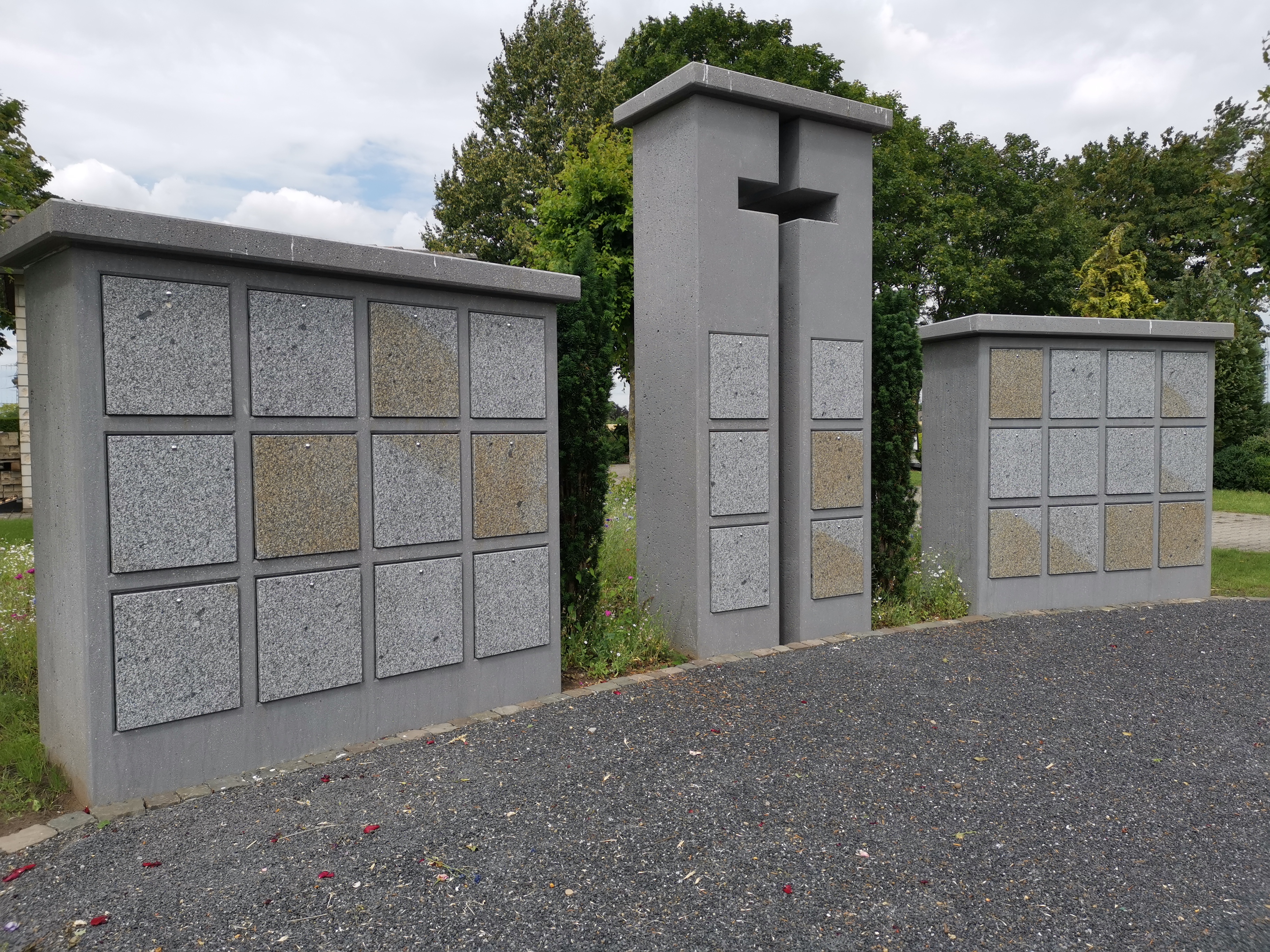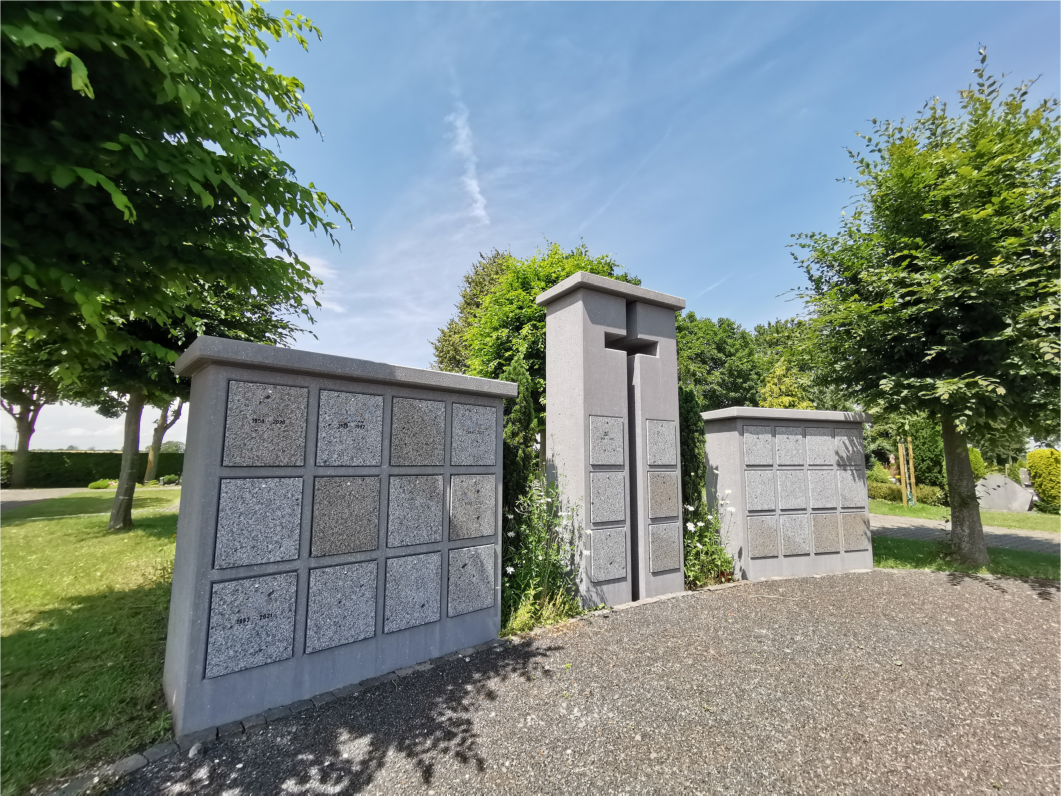 Ebenfalls verfügt der Friedhof seit März 2020 über eine Urnenstelen-Anlage (Kolumbarium) . Hier können die Urnen von Verstorbenen in verschiedenen Nischen ihre letzte Ruhestätte finden. Die Frontplatten aus (Thannsteiner Granit - ein deutscher Stein) werden dann mit Namen und Geburts- und Sterbejahr graviert. Die Anlage ist eingebettet in die offene und natürliche Gestaltung des Friedhofs. Mit dem großen Kreuz, was weit über den Friedhof sichtbar ist, zeigt sich hier zentral das Symbol unserer Hoffnung auf die Auferstehung.